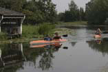 Wanneer ook deze boot onder de brug is verdwenen, is er even rust. De ondernemer maakt van de gelegenheid gebruik om zijn stoeltje te verplaatsen naar een schaduwplek aan de waterkant. Terwijl hij zicht houdt op terugkomende boten, vertelt hij: “We hebben hier drie types vaartuigen, namelijk de één- en tweepersoons kajak en de Canadese gezinskano’s, die je zojuist hebt gezien. Die laatste verhuren we het meest. In deze boot zitten de billen laag, waardoor ook het zwaartepunt laag is. Hierdoor kun je bijna niet omkieperen. Kanovaren wordt nogal eens geassocieerd met omslaan, maar dat is grote flauwekul. Ik durf te stellen dat een boot zelden onvrijwillig omgaat en gezinnetjes gaan al helemaal nooit om. Als je er namelijk niet op uit bent om de boot om te laten kieperen, dan gebeurt het ook niet. Wat dat betreft is een Canadees net een veerpont. We hebben hier al veel mensen gehad die op voorhand bang waren om te gaan varen, en die achteraf zo blij waren dat ze het toch hebben gedurfd, want er ging een wereld voor ze open. Zojuist was hier zelfs een man die niet kon zwemmen, en die heeft zich er ook overheen gezet. Het instappen is inderdaad even een techniek, maar als je die eenmaal door hebt is het zo simpel. Ik vind het alleen jammer dat de taakverdeling in een kano tamelijk rolbevestigend is: de vrouw voor- en de man achterin. Je doet eigenlijk jezelf tekort als je het niet allebei eens uitprobeert.”